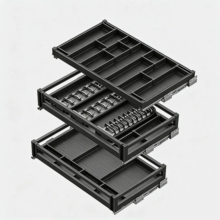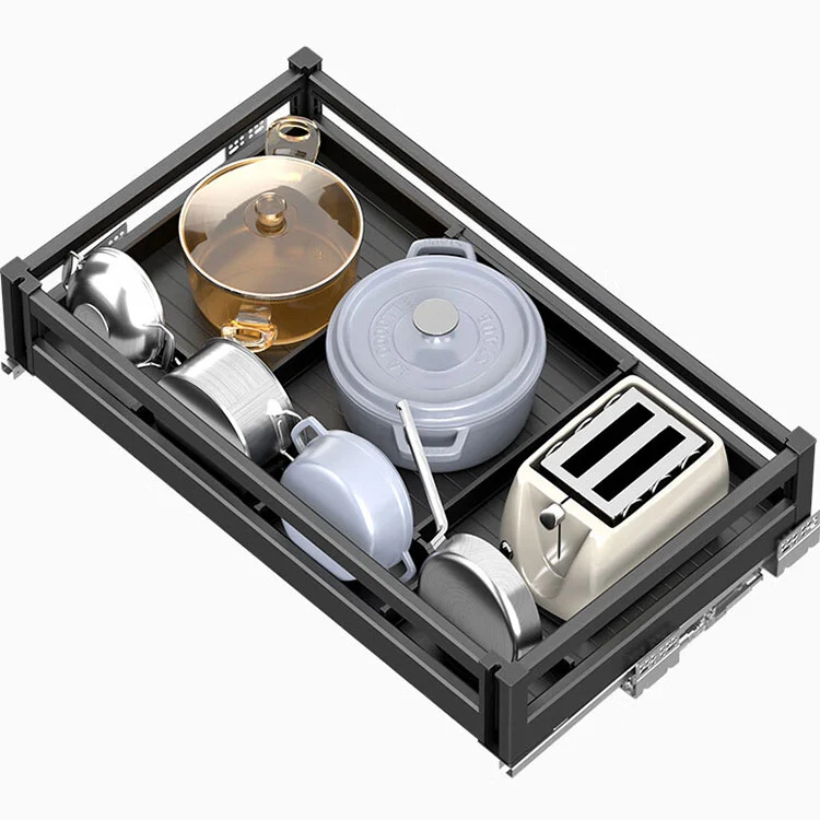 Bu alüminyum alaşımlı çekilebilir sepet, esas olarak tabaklar, tencereler ve baharatlar gibi mutfak eşyalarının sınıflandırılmış olarak depolanması için kullanılan gömülü bir mutfak depolama donanımıdır. Bu mutfak dolabı çekmecesi, modern mutfaklar için özel olarak tasarlanmış gömülü bir depolama çözümüdür. Katmanlı tasarımı ve temelindeki pratik işlevlerle, dağınık iç depolama ve dolaplarda az yer kullanımı sorunlarını kolayca çözer ve mutfak depolaması için mükemmel bir yardımcıdır.
