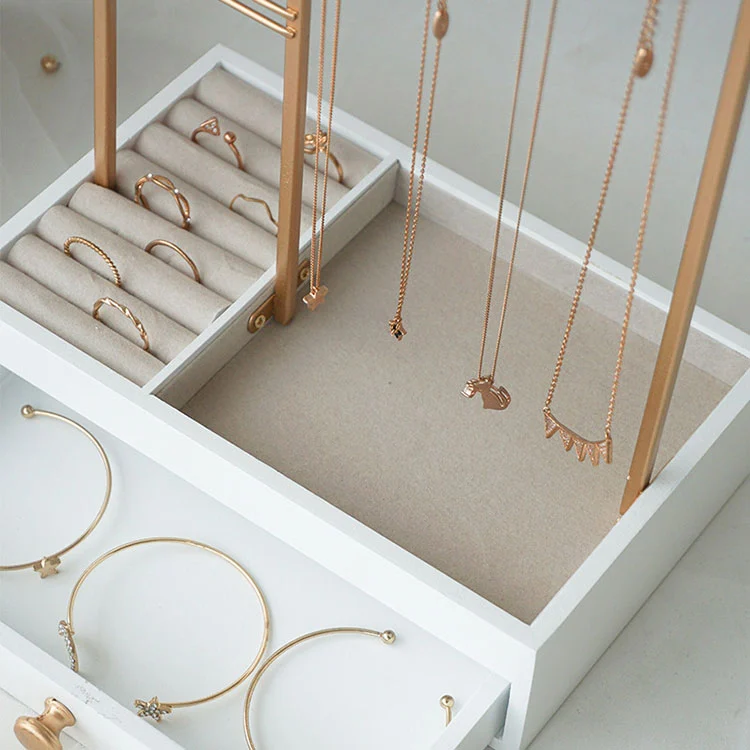 Üst katman açık teşhir alanı: Kolye, küpe ve bilezik asmak için uygun altın metal çerçeve. Görülmesi kolaydır ve gerektiğinde erişilebilir.