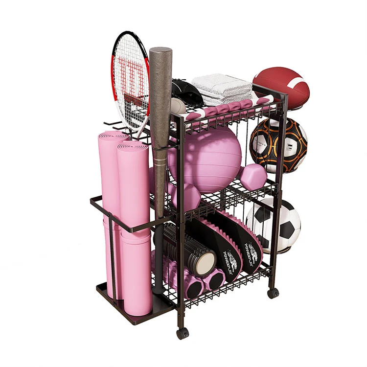 Bu yerde duran metal yoga matı depolama rafı, üç katmana ve iki yan depolama sistemine sahiptir. Sol taraf bağımsız olarak tasarlanmış olup, dik yerleştirildiğinde 2-3 normal boyutlu yoga matını alabilecek alanı genişletmektedir. Dik depolama aynı zamanda tenis raketleri, beyzbol sopaları, hokey sopaları vb. gibi uzun tip ekipmanları da barındırabilir.